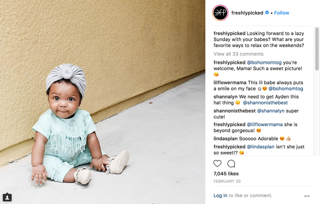 Freshly Picked uses their customer’s content to interact with their members and moms over multiple different platforms. They promote their products using photos that mothers post of their children online in the shoes using the brand’s personalized hashtag. This not only displays their product in action, but secures for others that people like and trust their brand.